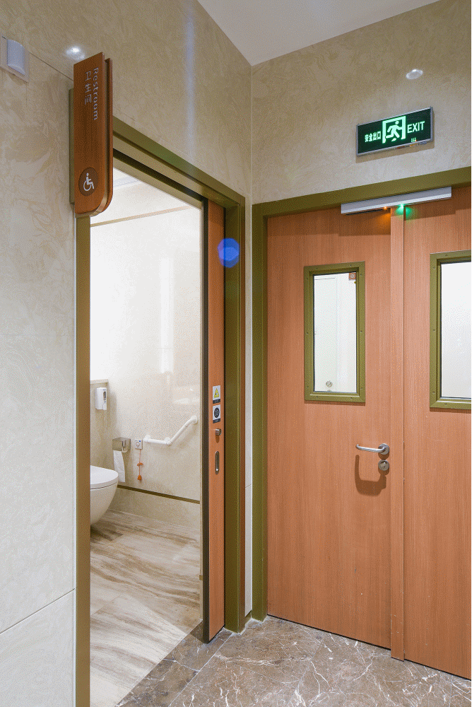 无障碍区域,采用国际先进的滚珠轨道移门系统,高精度的滚珠和精细的凹槽,进行很好的配合,开启轻松顺滑,自动关闭,末端缓冲;它无声的运行着,默默地守护者穿梭于门扇的人群,为医患人员带来无限出入便利。